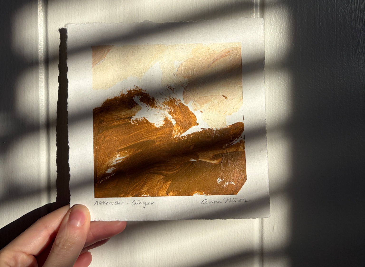 A few years back, my favorite painter did a series inspired by a certain color each month. Anna created small pieces in her classic abstract style, and I ended up with one of the November “Ginger” creations. To say I love it would be an understatement. The painting reminds me of moments in my life where the mere experience of being has felt raw and crispy, sharp and overpowering. Unframed with raw paper edges, it lived near my desk at work for a while, then in a frame on my bedroom wall, and now on a bookshelf in my living room. I’m beginning to believe that sometimes art must change its dwelling place every so often to be seen anew, absorbed fresh, and appreciated in a new light.